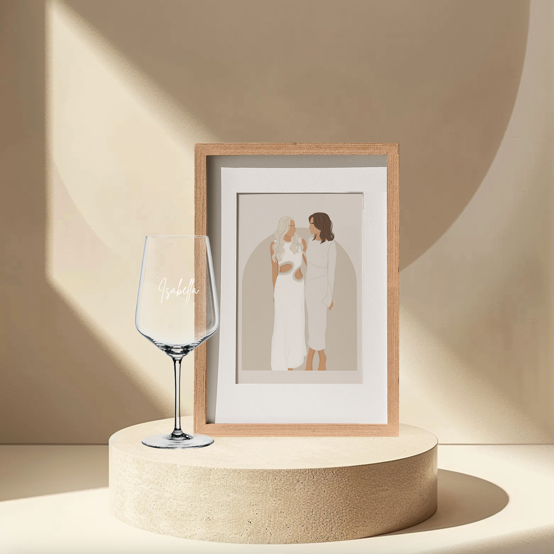 Designed to create the perfect personalised experience for any gifting occasion. Our Memories into Moments includes a custom illustration, beautifully displayed in our medium-sized frame, alongside an Eternally Etched wine glass.