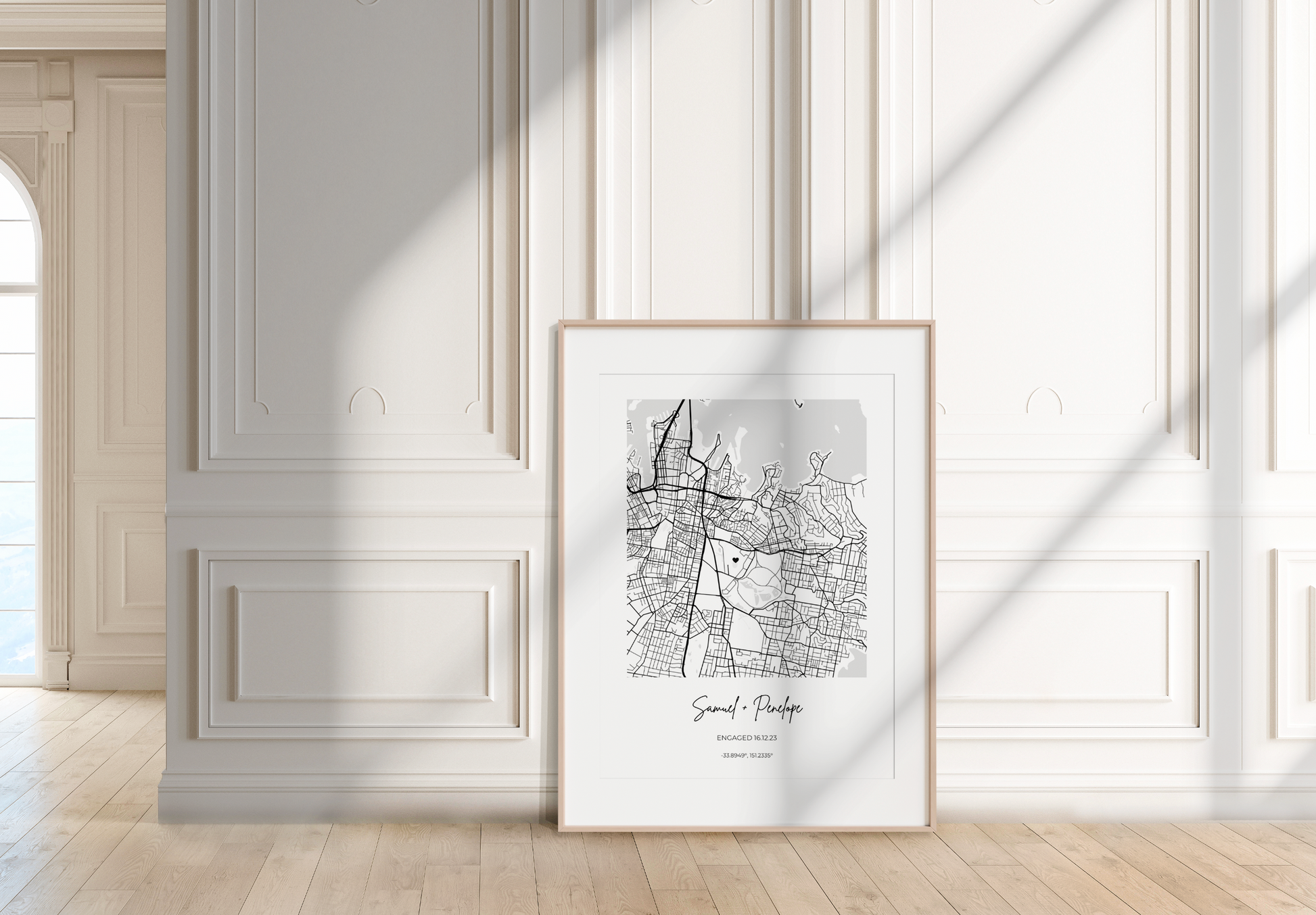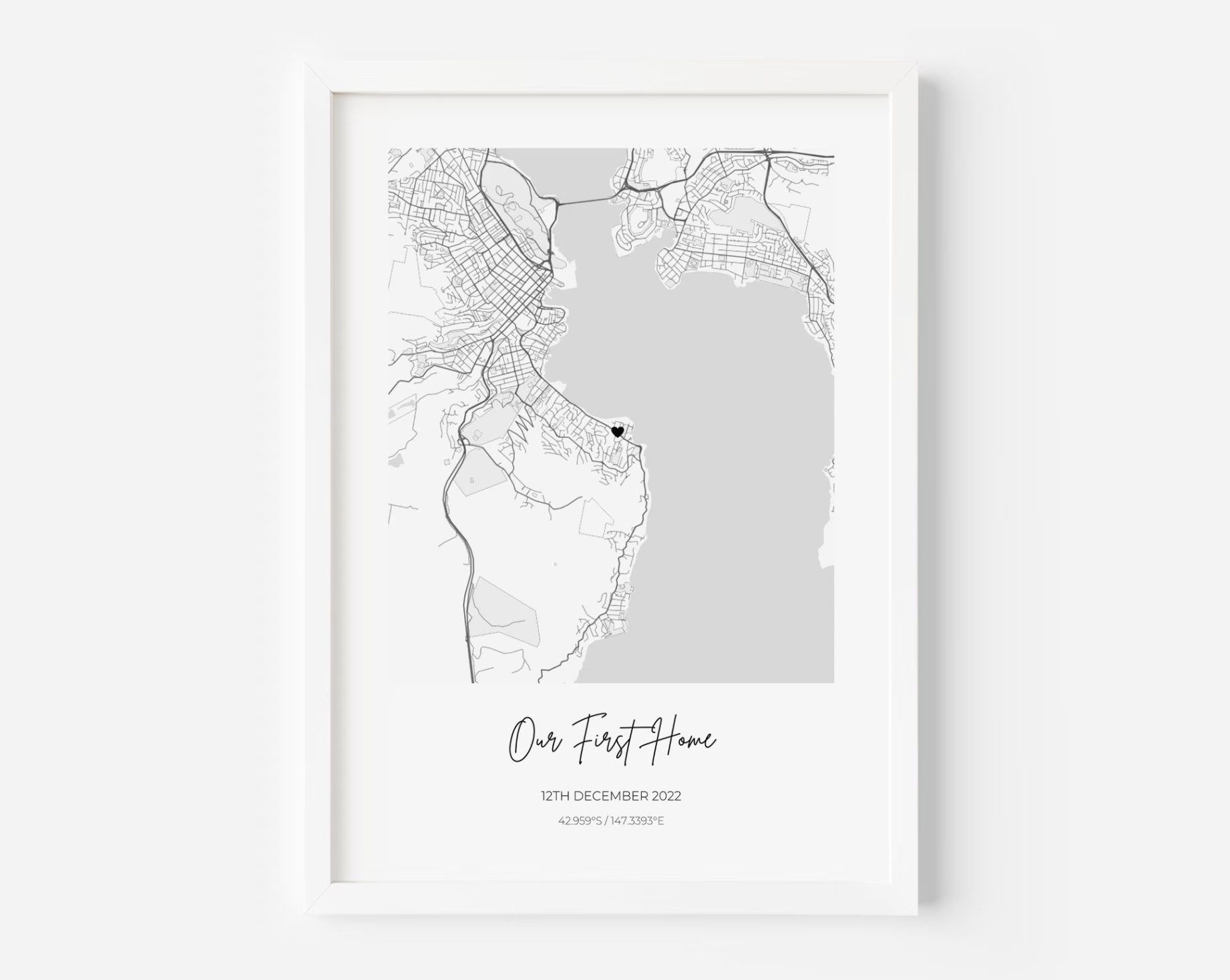 Celebrate any special location with our Location Map Poster. Featuring a black and white arial map of your chosen location, quote, sub quote and coordinates. This print creates a truely personalised gift for weddings, new homes, businesses etc!